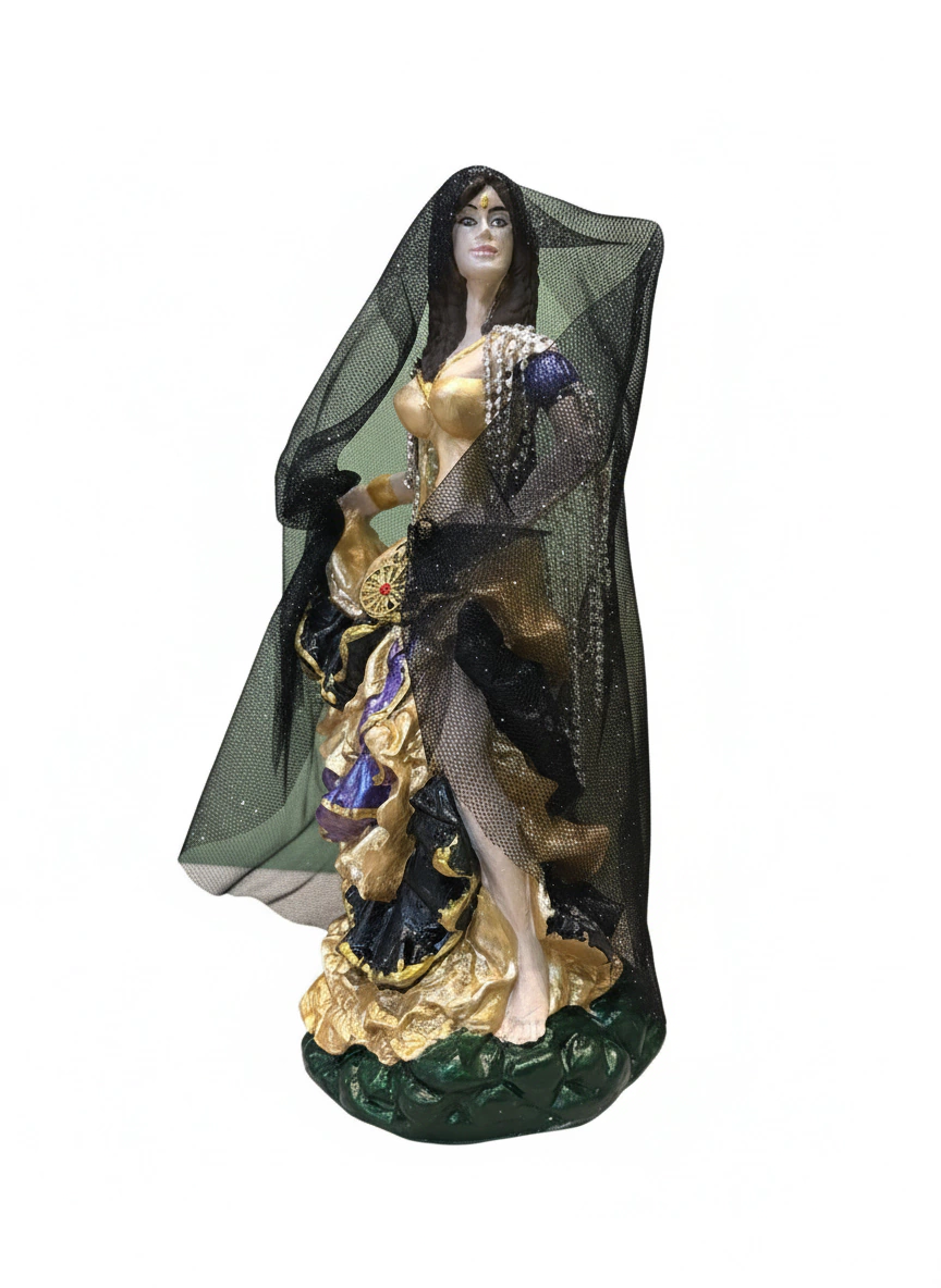 Imagem 25cm - Cigana do Oriente – a musa do mistério e da prosperidade chegou para encantar seu altar! Com dourado, preto e roxo, seu véu de tule brilhante é puro glamour espiritual. Feita em gesso com acabamento caprichado, é o toque perfeito para quem quer atrair sorte com estilo. Quer magia? A Cigana do Oriente tem! Garanta já a sua e deixe a prosperidade bater à sua porta com muito charme!
